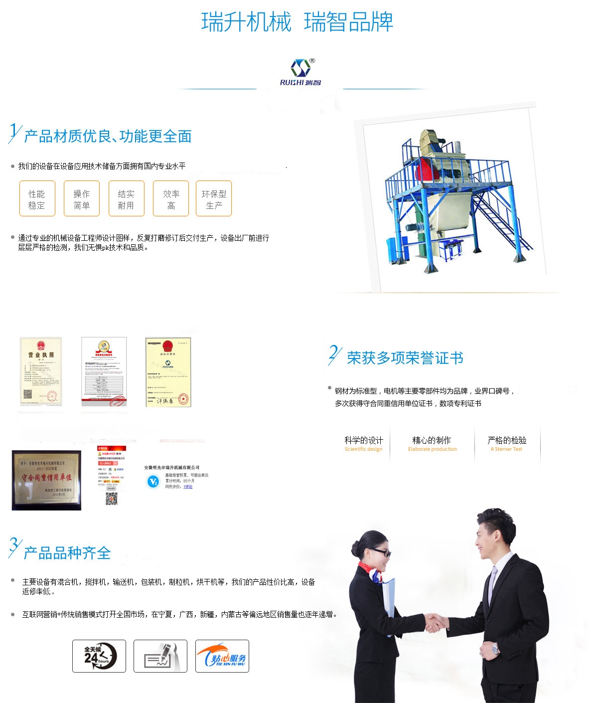 安徽瑞升機械制造有限公司坐落在明光市工業(yè)園區(qū),本公司產品主要用于粉料物質,顆粒物質的混合、攪拌、輸送、包裝的自動化生產設備。工廠占地面積為1萬多平方現(xiàn)有6000平方米的生產車間和各類加工檢測設備,具備產品開發(fā)、研制、設計、生產、試驗、倉儲運輸?shù)饶芰Γ梢陨a多種規(guī)格、多種非標定制的產品,并有多項技術獲得國家專利,擁有自主進出口權,公司憑借優(yōu)良的技術、先進的工藝和科學的管理理念,所生產的產品已暢銷全國各地,部分產品已進入馬耳他、印度尼西亞、韓國、羅馬尼亞、沙特阿拉伯、馬來西亞、印度、巴基斯坦、等國家和地區(qū),受到國內外客戶的高度認可和信賴。 本公司獲得守合同重信用單位證書,對原材料的采購極為細致,鋼材為標準型,電機等主要零部件均為品牌,數(shù)項專利證書。技術方面我司擁有一支國內的技術和管理團隊,在機械設備應用...公司資質榮譽